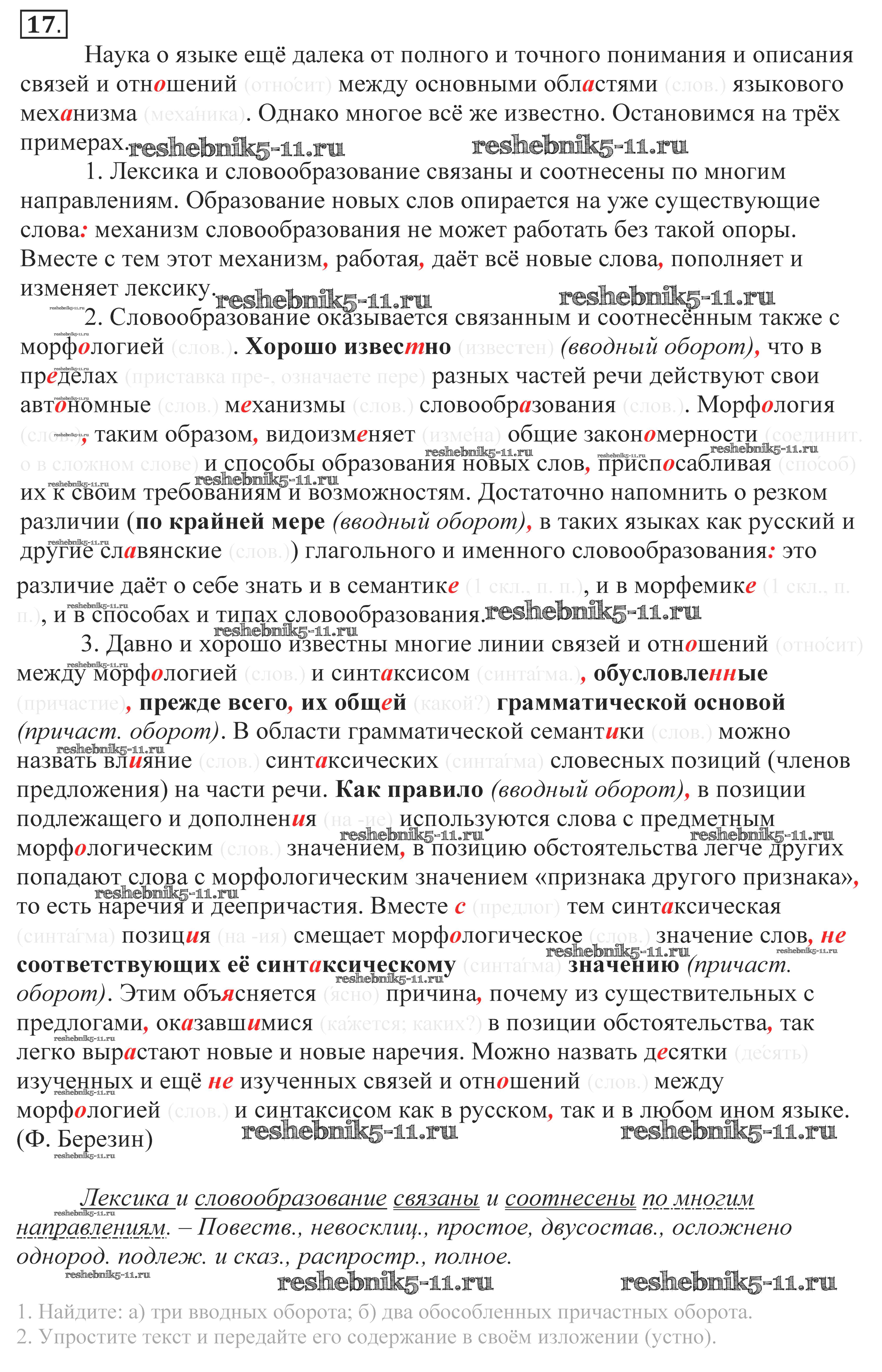 Готовая домашняя работа с ответами по Русскому языку за 10, 11 класс Власенков, Рыбченкова Учебник Базовый уровень Просвещение 2014 - Упражнения 17