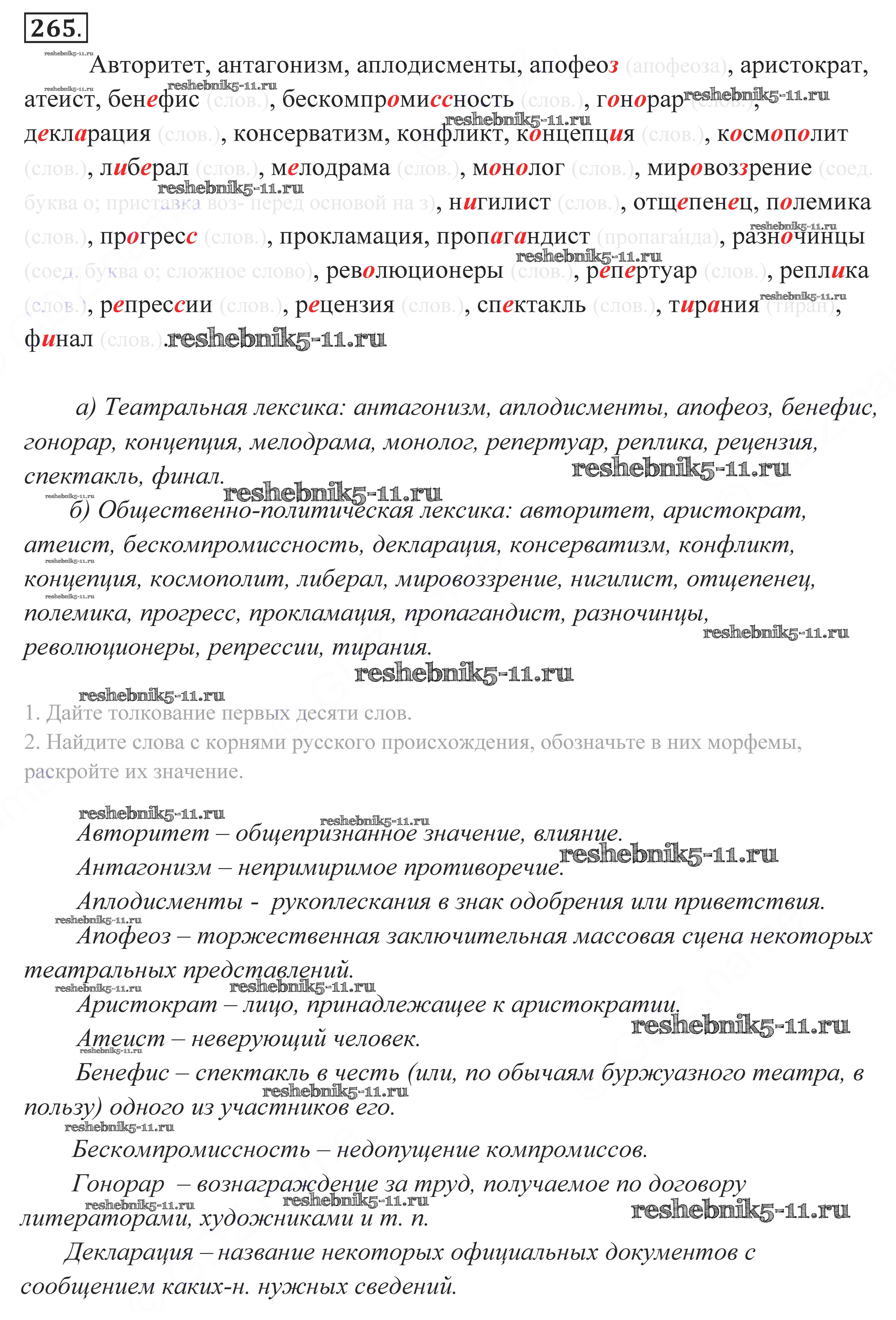 Готовая домашняя работа с ответами по Русскому языку за 10, 11 класс Власенков, Рыбченкова Учебник Базовый уровень Просвещение 2014 - Упражнения 265