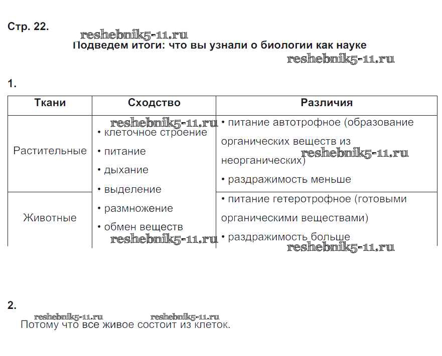 Готовая домашняя работа с ответами по Биологии за 5 класс Корнилова, Симонова, Николаев Рабочая тетрадь Вентана-граф 2020 ФГОС - Страницы тетради 22