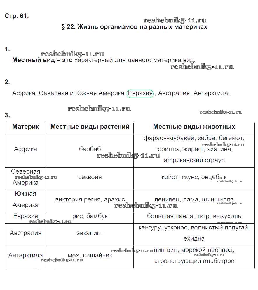 Готовая домашняя работа с ответами по Биологии за 5 класс Корнилова, Симонова, Николаев Рабочая тетрадь Вентана-граф 2020 ФГОС - Страницы тетради 61