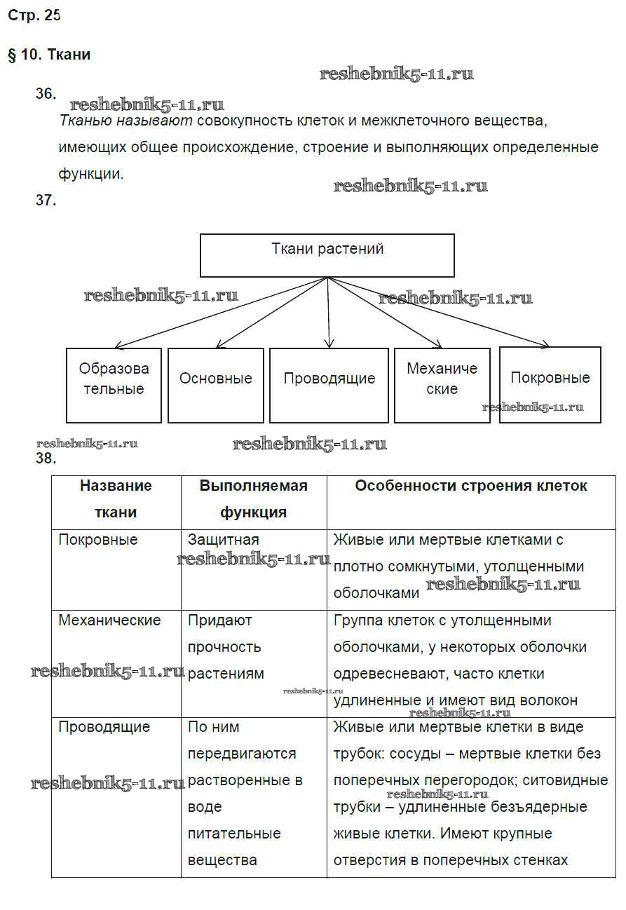 Готовая домашняя работа с ответами по Биологии за 5 класс Пасечник Рабочая тетрадь Вертикаль Дрофа 2015 ФГОС - § 10. Ткани стр. 25