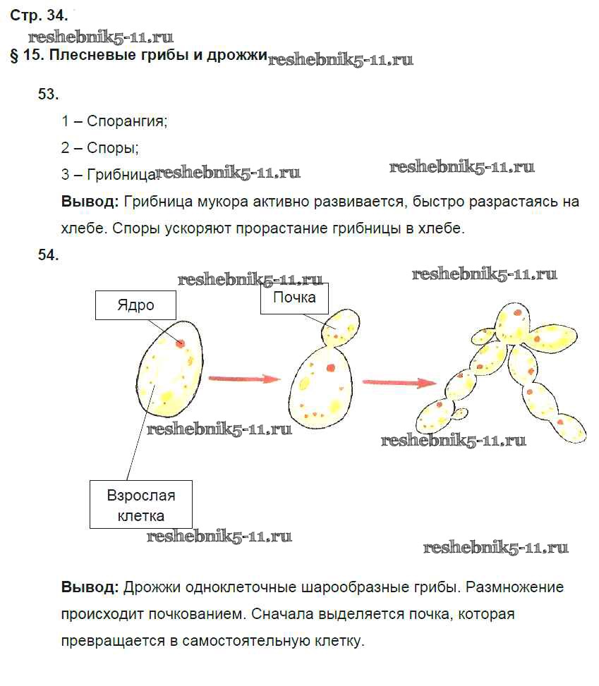 Готовая домашняя работа с ответами по Биологии за 5 класс Пасечник Рабочая тетрадь Вертикаль Дрофа 2015 ФГОС - § 15. Плесневые грибы и дрожжи стр. 34