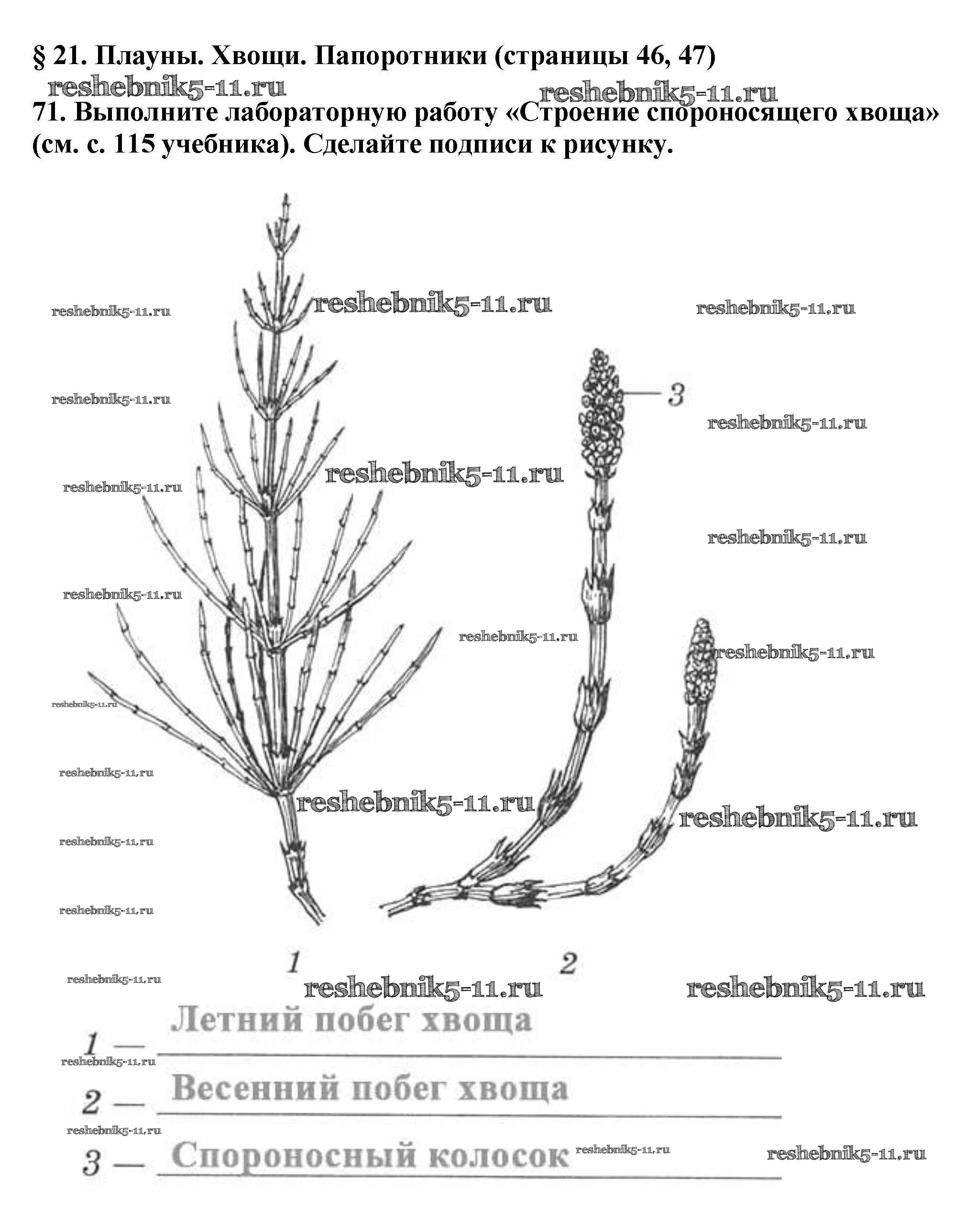 Готовая домашняя работа с ответами по Биологии за 5 класс Пасечник Рабочая тетрадь Вертикаль Дрофа 2015 ФГОС - § 21. Плауны. Хвощи. Папоротники стр. 46