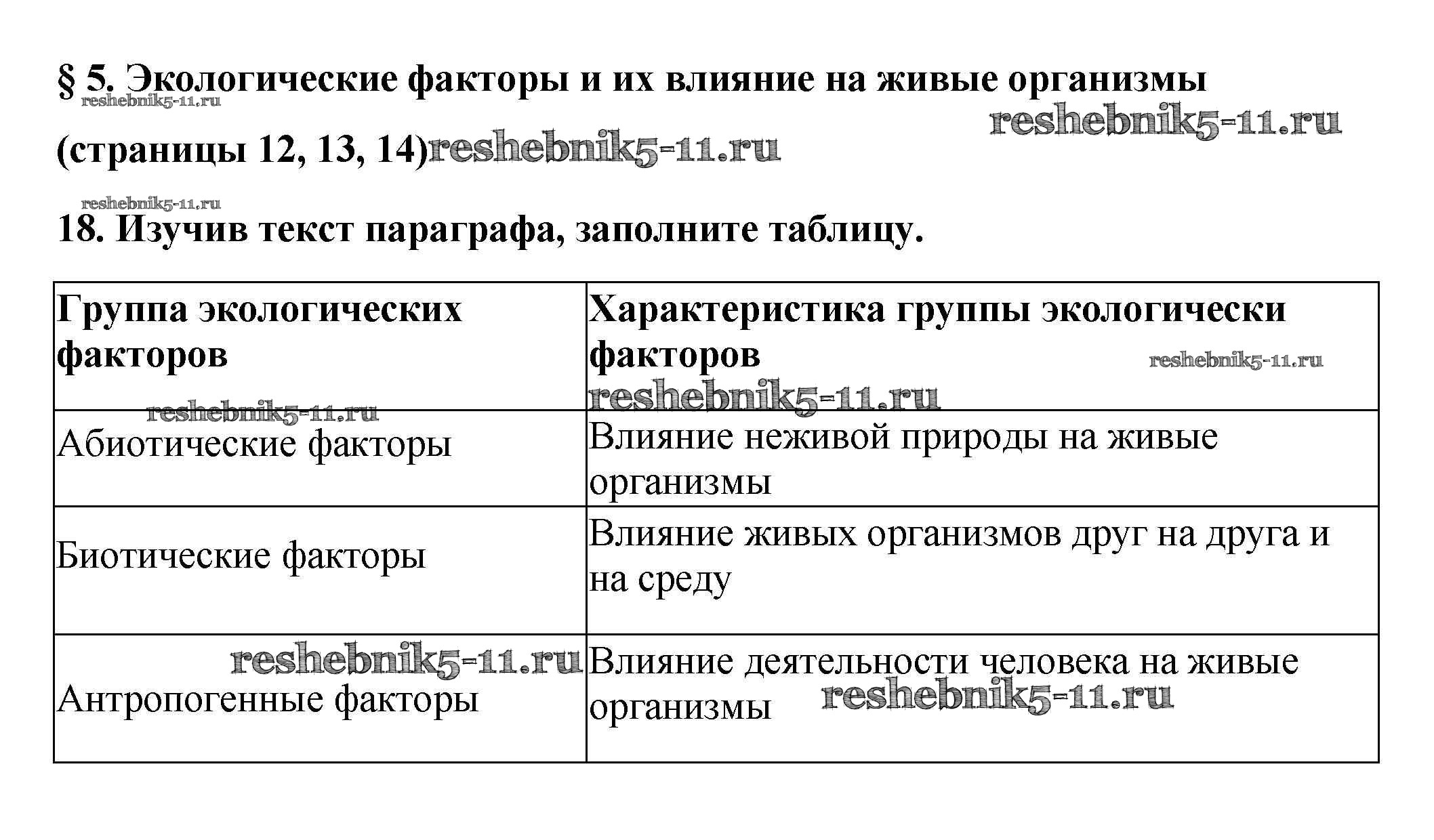 Готовая домашняя работа с ответами по Биологии за 5 класс Пасечник Рабочая тетрадь Вертикаль Дрофа 2015 ФГОС - § 5. Экологические факторы и их влияние на живые организмы стр. 12