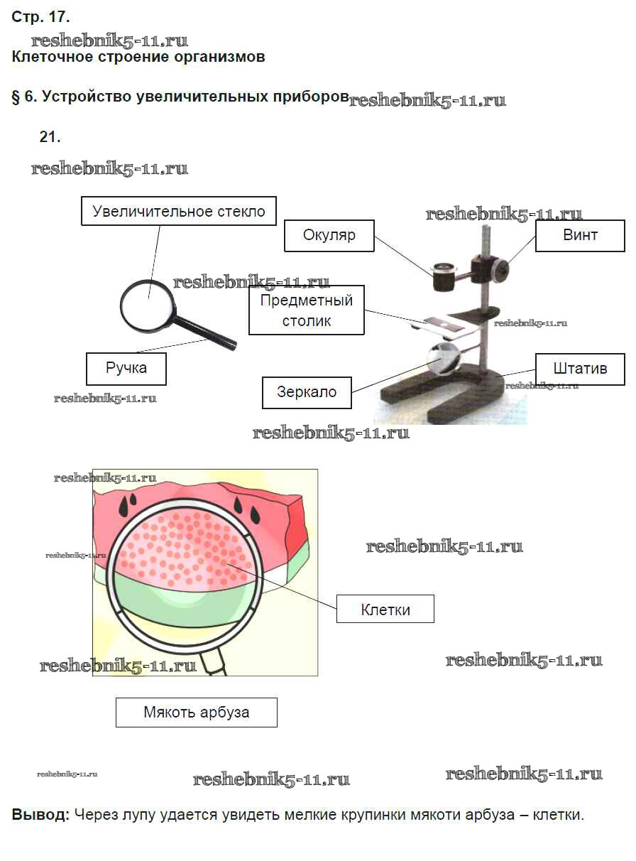 Готовая домашняя работа с ответами по Биологии за 5 класс Пасечник Рабочая тетрадь Вертикаль Дрофа 2015 ФГОС - § 6. Устройство увеличительных приборов стр. 17