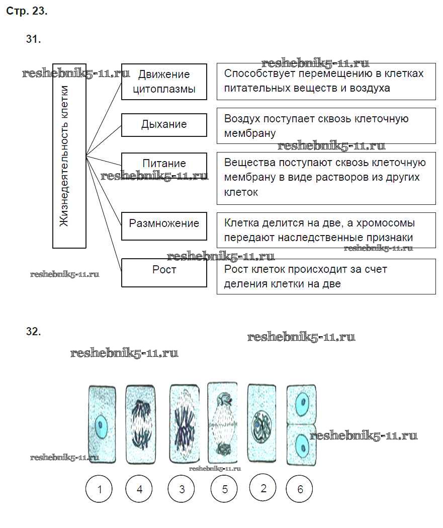 Готовая домашняя работа с ответами по Биологии за 5 класс Пасечник Рабочая тетрадь Вертикаль Дрофа 2015 ФГОС - § 9. Жизнедеятельность клетки, её деление и рост стр. 23