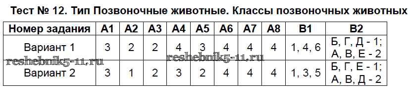 Готовая домашняя работа с ответами по Биологии за 5 класс Богданов Контрольно-измерительные материалы (КИМ) ВАКО 2017 ФГОС - Тесты Тест №12. Тип Позвоночные животные. Классы позвоночных животных