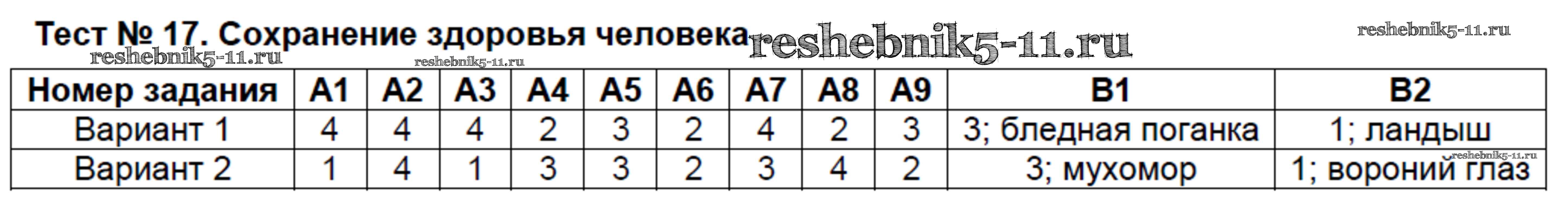 Готовая домашняя работа с ответами по Биологии за 5 класс Богданов Контрольно-измерительные материалы (КИМ) ВАКО 2017 ФГОС - Тесты Тест №17. Сохранение здоровья человека