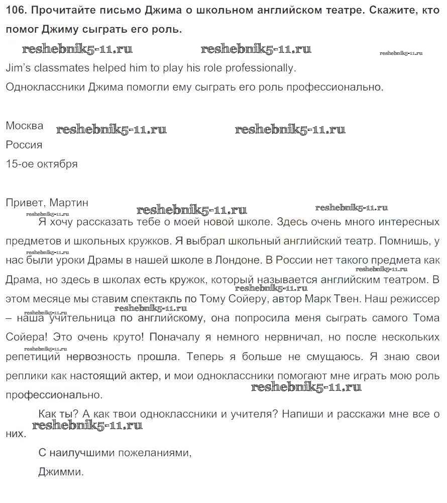 Готовая домашняя работа с ответами по Английскому языку за 5 класс Биболетова, Денисенко, Трубанева Учебник Enjoy English Титул 2015 ФГОС - Unit 1. Hello! Nice to see you again! 106
