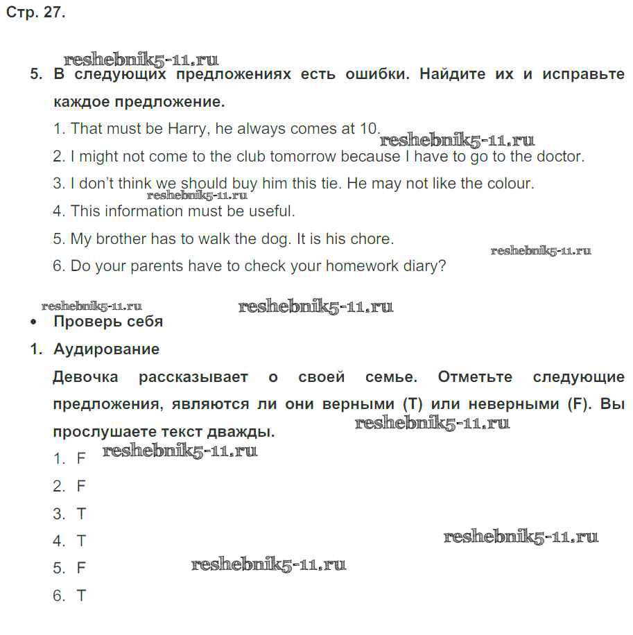 Готовая домашняя работа с ответами по Английскому языку за 5 класс Кузовлев, Лапа, Костина, Дуванова, Кузнецова Рабочая тетрадь Академический школьный учебник Просвещение 2013 ФГОС - Unit 2. Rules around us стр. 27