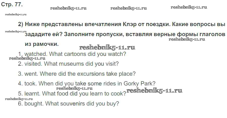 Готовая домашняя работа с ответами по Английскому языку за 5 класс Кузовлев, Лапа, Костина, Дуванова, Кузнецова Рабочая тетрадь Академический школьный учебник Просвещение 2013 ФГОС - Unit 6. We've had a nice trip to England стр. 77