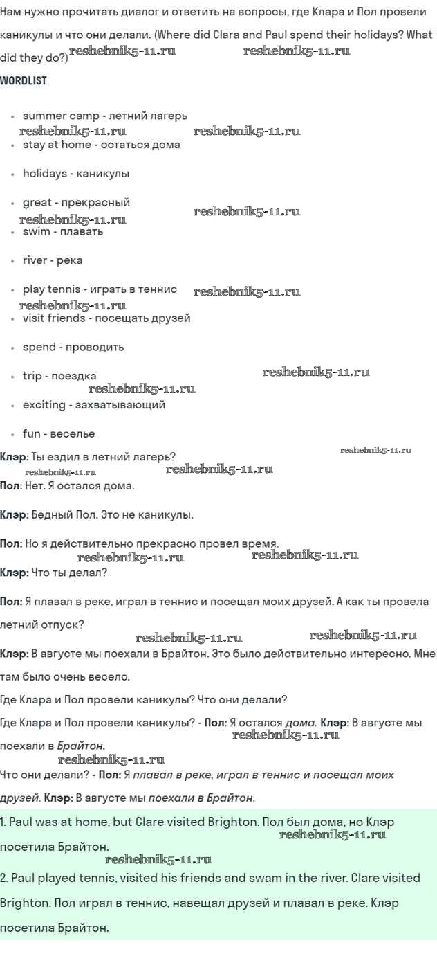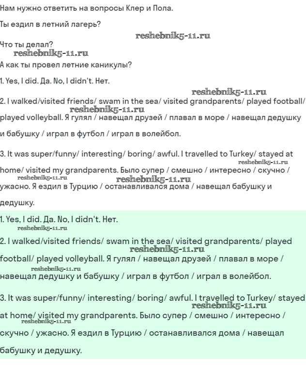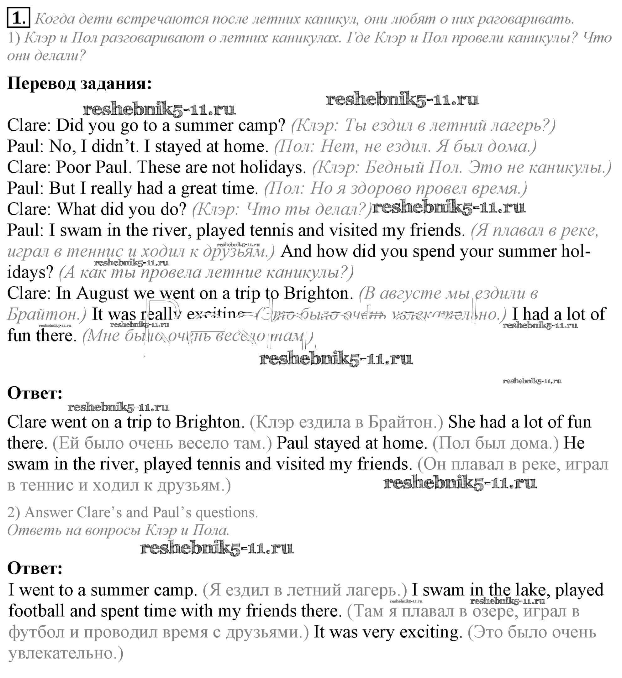 Готовая домашняя работа с ответами по Английскому языку за 5 класс Кузовлев, Лапа, Костина, Дуванова, Кузнецова Учебник УМК Просвещение 2015 ФГОС - Lesson 3. How I spent my summer holidays 1