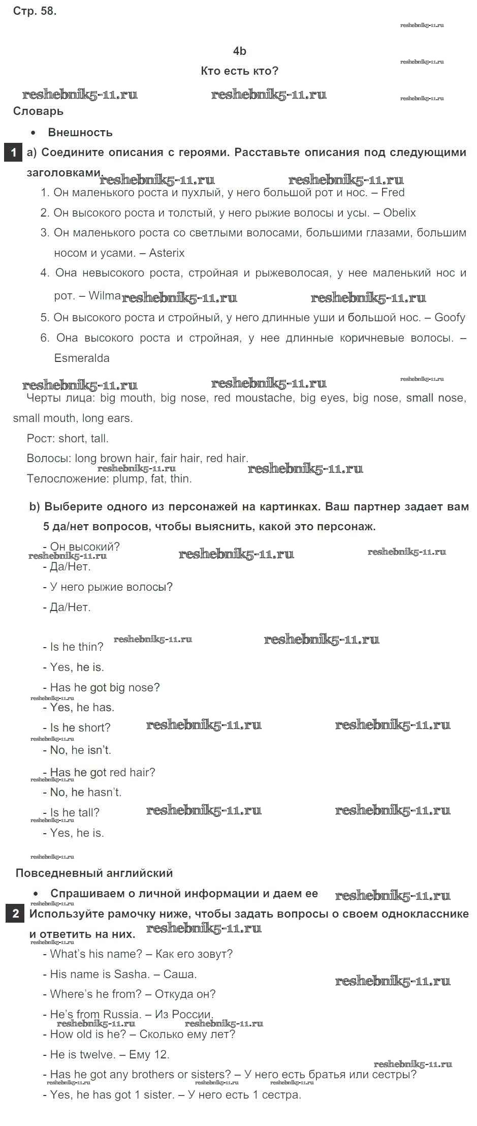 Готовая домашняя работа с ответами по Английскому языку за 5 класс Ваулина, Дули, Подоляко, Эванск Учебник Spotlight Просвещение 2015 ФГОС - Module 4. Family ties стр. 58
