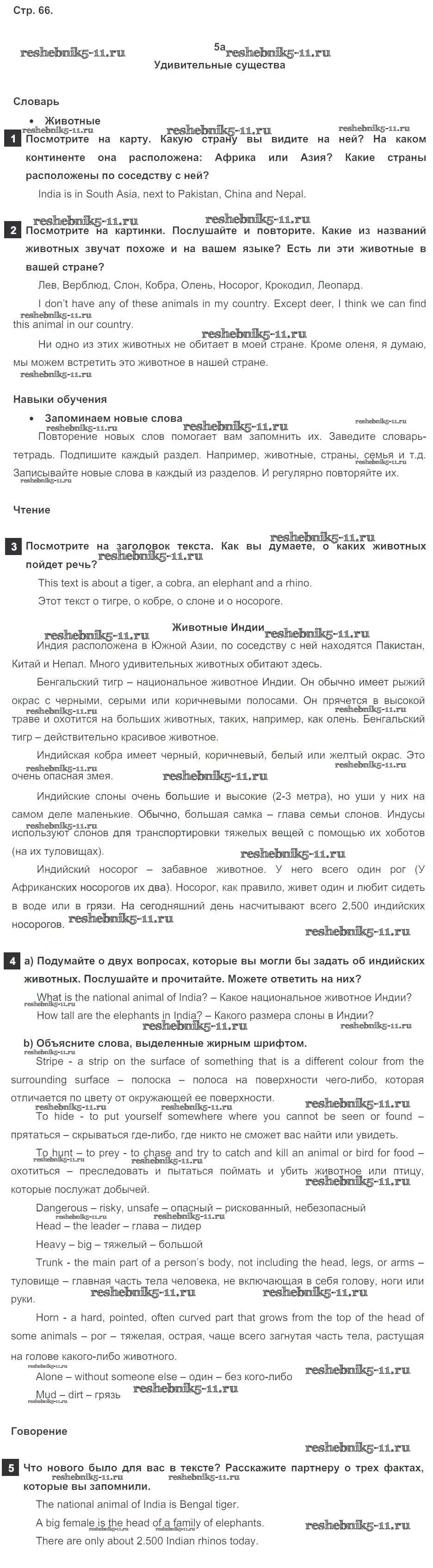 Готовая домашняя работа с ответами по Английскому языку за 5 класс Ваулина, Дули, Подоляко, Эванск Учебник Spotlight Просвещение 2015 ФГОС - Module 5. World animals стр. 66