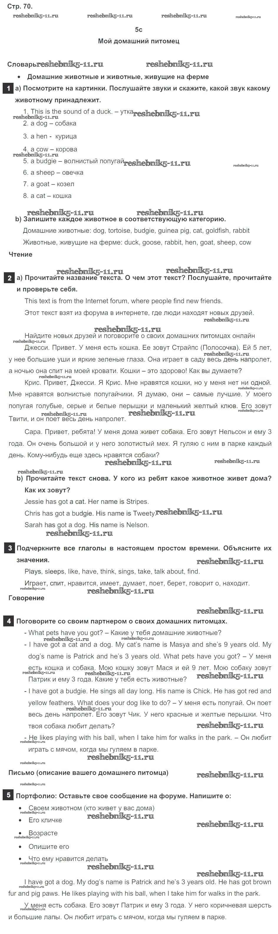 Готовая домашняя работа с ответами по Английскому языку за 5 класс Ваулина, Дули, Подоляко, Эванск Учебник Spotlight Просвещение 2015 ФГОС - Module 5. World animals стр. 70