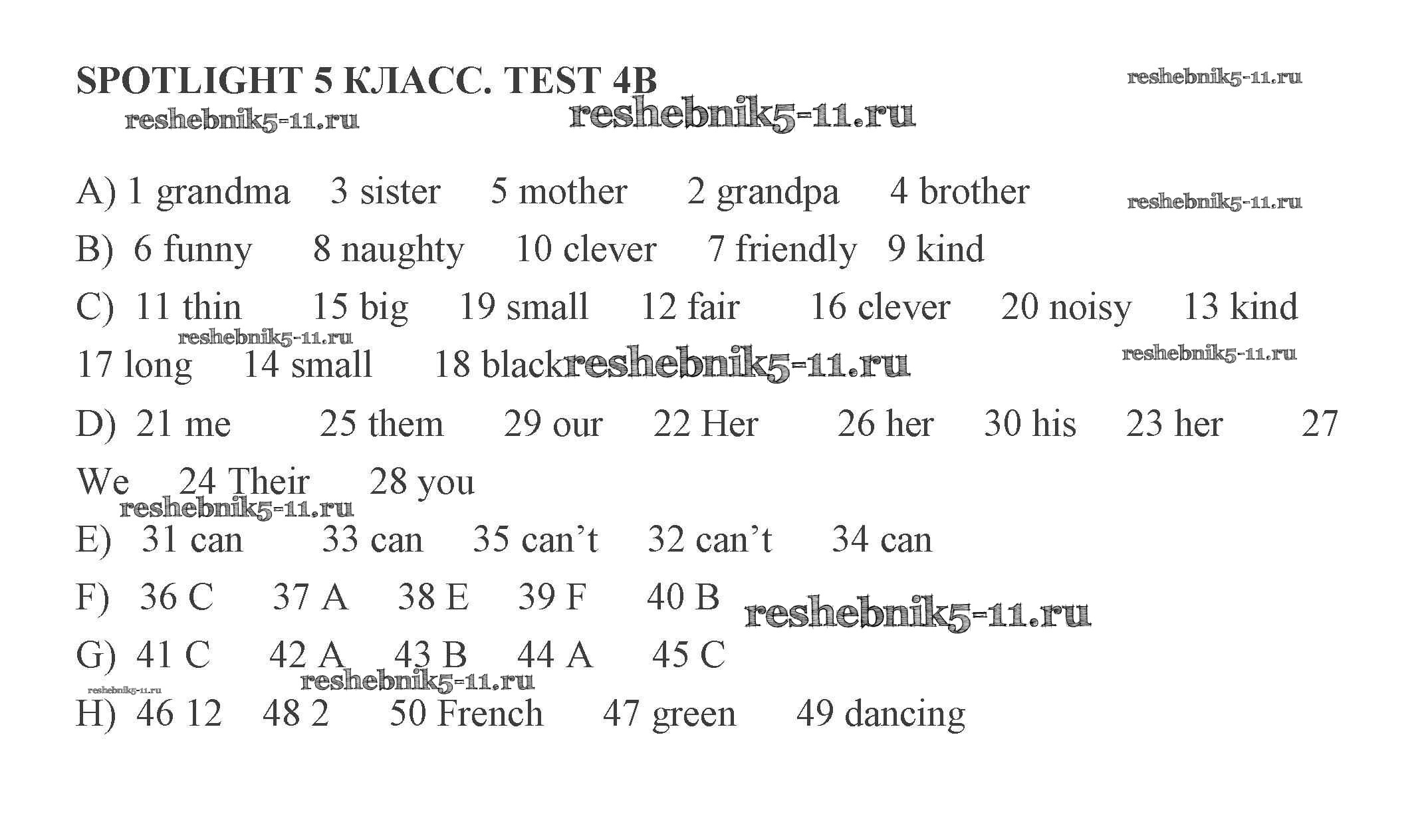 Готовая домашняя работа с ответами по Английскому языку за 5 класс Ваулина, Дули, Подоляко, Эванс Контрольные задания Spotlight Просвещение 2018 - Тест 4 (Варианты) 2