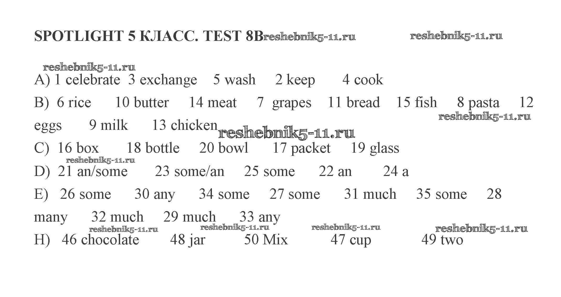 Готовая домашняя работа с ответами по Английскому языку за 5 класс Ваулина, Дули, Подоляко, Эванс Контрольные задания Spotlight Просвещение 2018 - Тест 8 (Варианты) 2