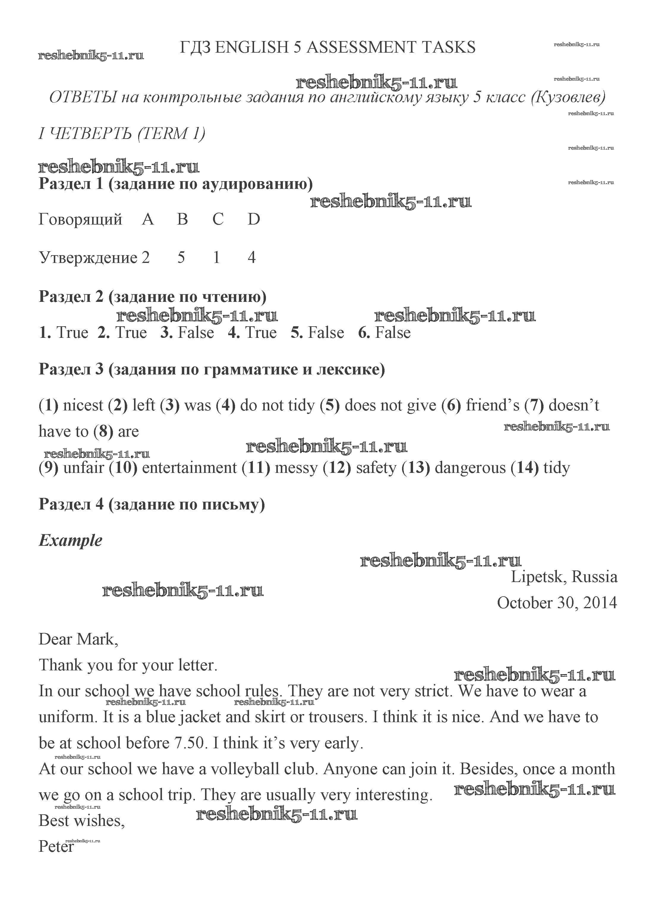 Английский язык за 5 класс Кузовлев Контрольные задания Просвещение term 1