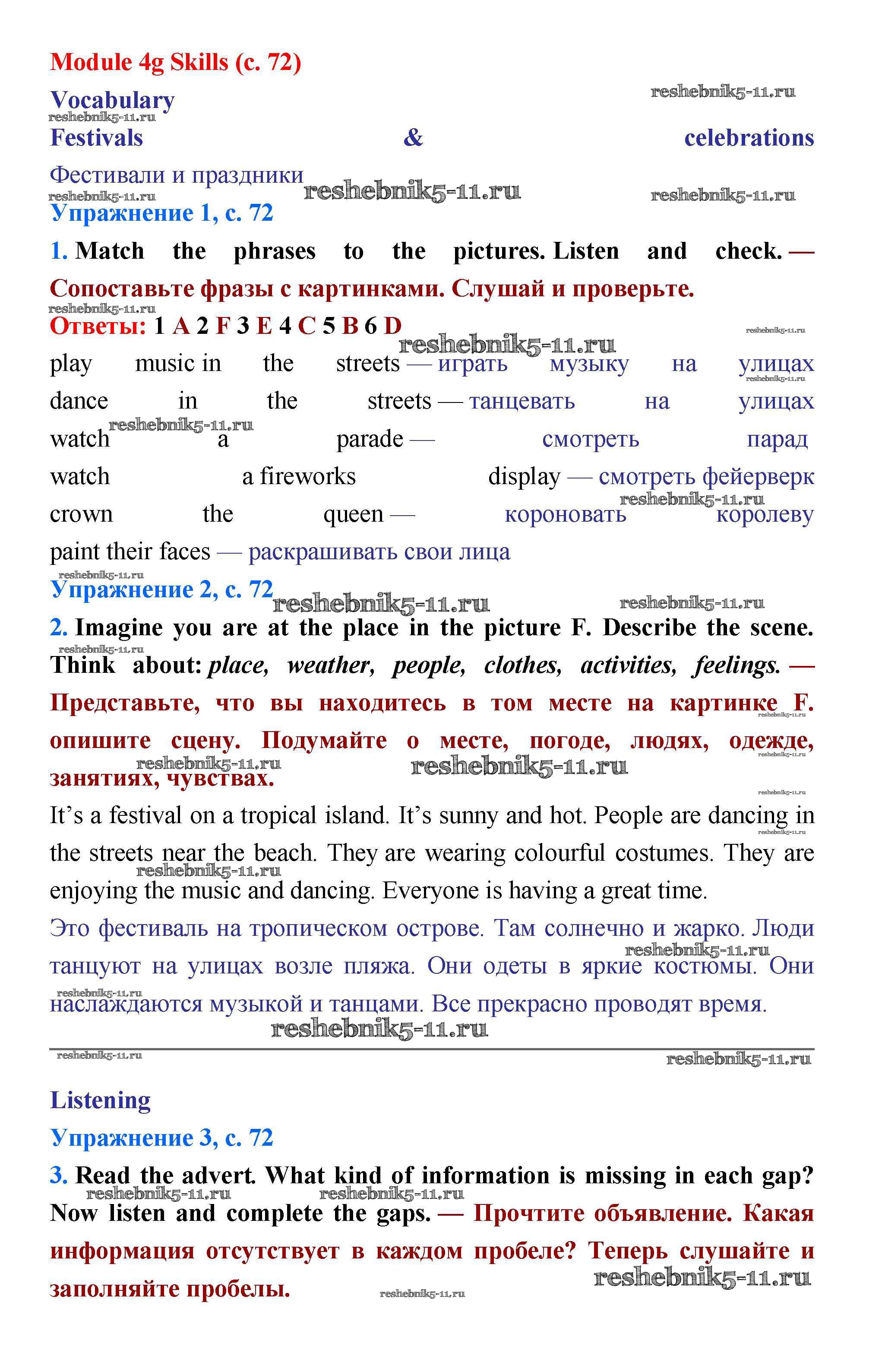 Готовая домашняя работа с ответами по Английскому языку за 5 класс Баранова, Эванс, Дули, Копылова, Мильруд Учебник Starlight Углубленный уровень Просвещение 2015 - Module 4. Come rain or shine стр.72