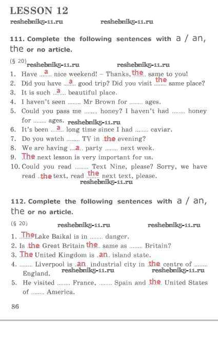 Готовая домашняя работа с ответами по Английскому языку за 5 класс Барашкова Сборник упражнений УМК Часть 1 Экзамен 2020 ФГОС - Lesson 12 стр. 86
