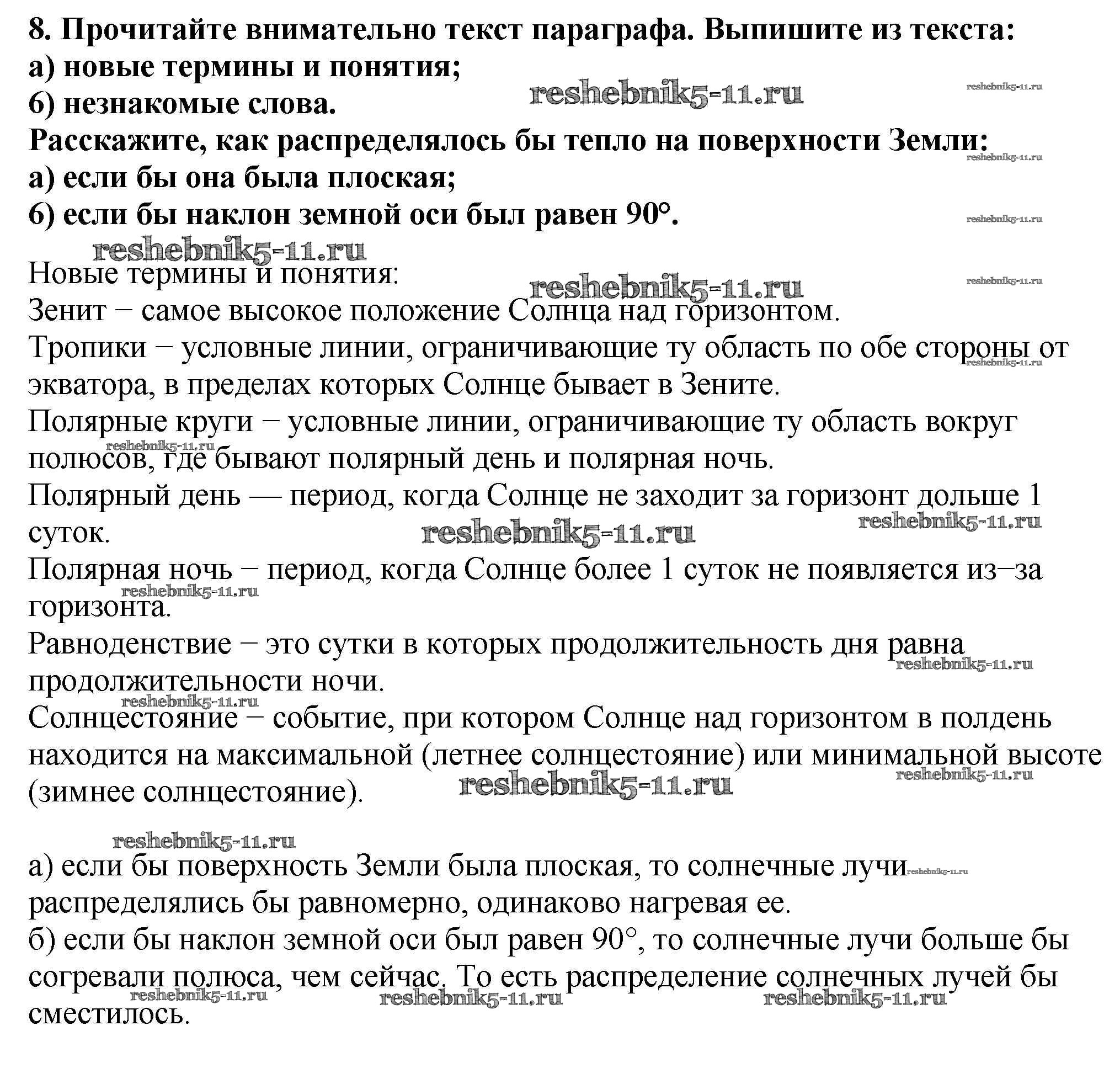 Готовая домашняя работа с ответами по Географии за 5, 6 класс Алексеев, Николина, Липкина Учебник Полярная звезда Просвещение 2018 ФГОС - §7. Солнечный свет на Земле 8