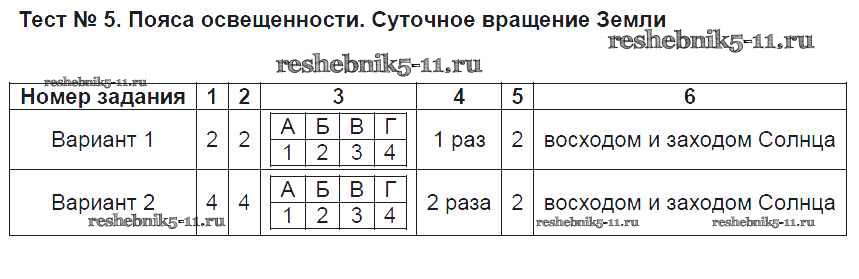 Готовая домашняя работа с ответами по Географии за 5 класс Пятунин, Пятунина Тесты УМК Экзамен 2017 ФГОС - Земля как планета солнечной системы Тест 5