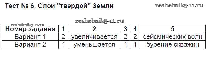 Готовая домашняя работа с ответами по Географии за 5 класс Пятунин, Пятунина Тесты УМК Экзамен 2017 ФГОС - Внутреннее строение земли Тест 6