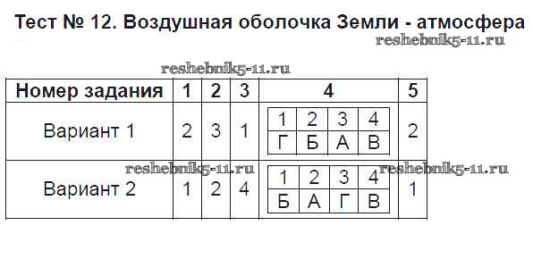 Готовая домашняя работа с ответами по Географии за 5 класс Пятунин, Пятунина Тесты УМК Экзамен 2017 ФГОС - Атмосфера Тест 12