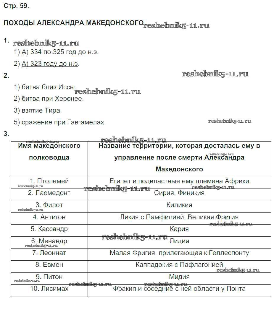 Готовая домашняя работа с ответами по Истории за 5 класс Абрамов, Абрамова Рабочая тетрадь Вертикаль Дрофа 2019 ФГОС - Тема 7. Создание державы Александра Македонского. Эпоха эллинизма стр. 59