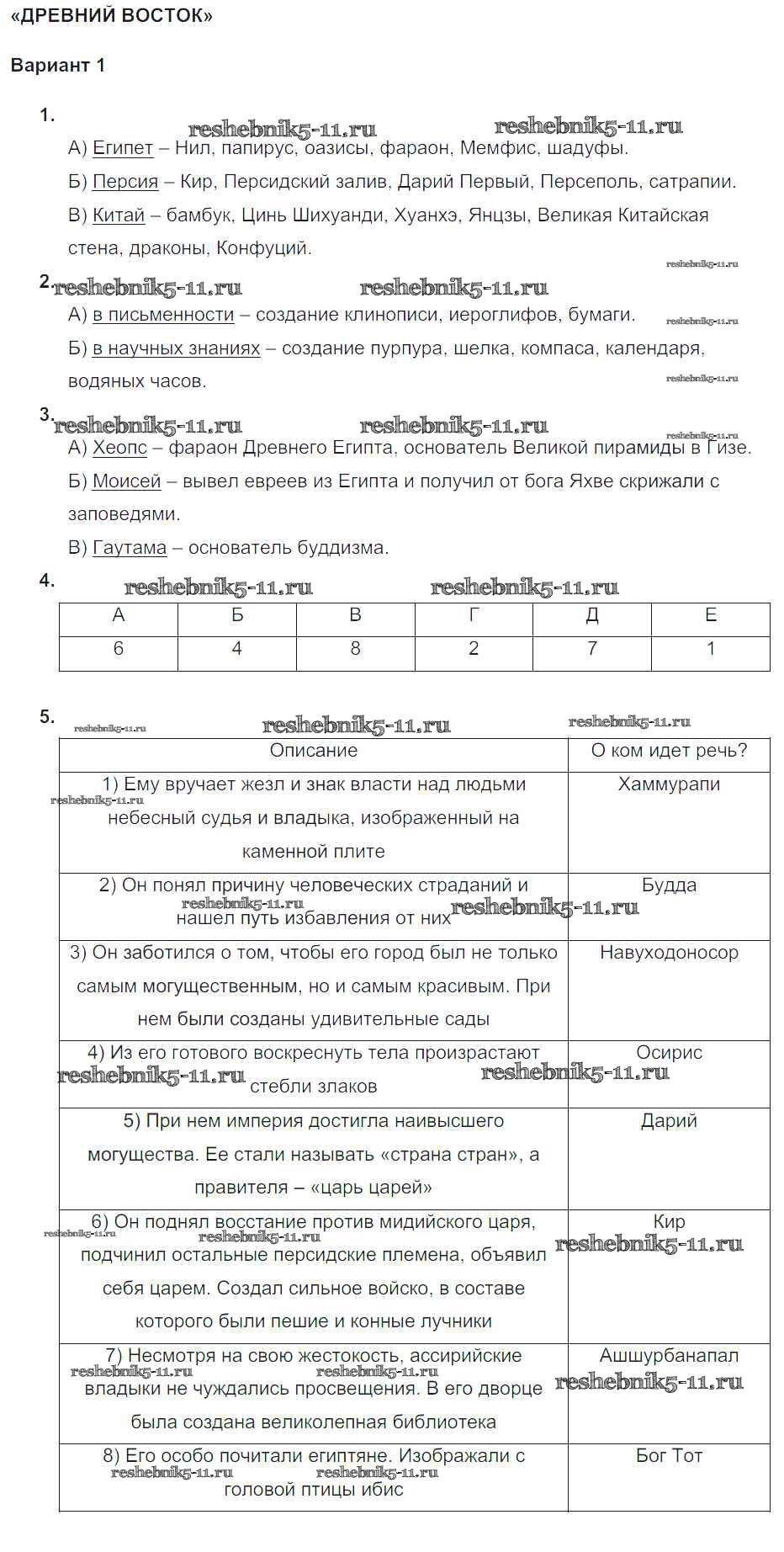 Готовая домашняя работа с ответами по Истории за 5 класс Саплина Тематический контроль Национальное образование 2016 ФГОС - КР-2. Древний Восток вариант №1