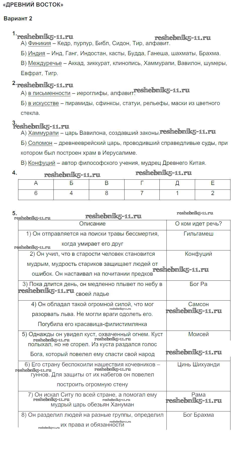 Готовая домашняя работа с ответами по Истории за 5 класс Саплина Тематический контроль Национальное образование 2016 ФГОС - КР-2. Древний Восток вариант №2