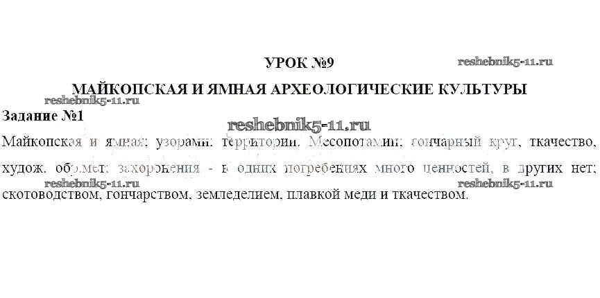 Готовая домашняя работа с ответами по Кубановедению за 5 класс Трехбратов Рабочая тетрадь Традиция 2019 - Урок № 9. Майкопская и Ямная археологические культуры 1