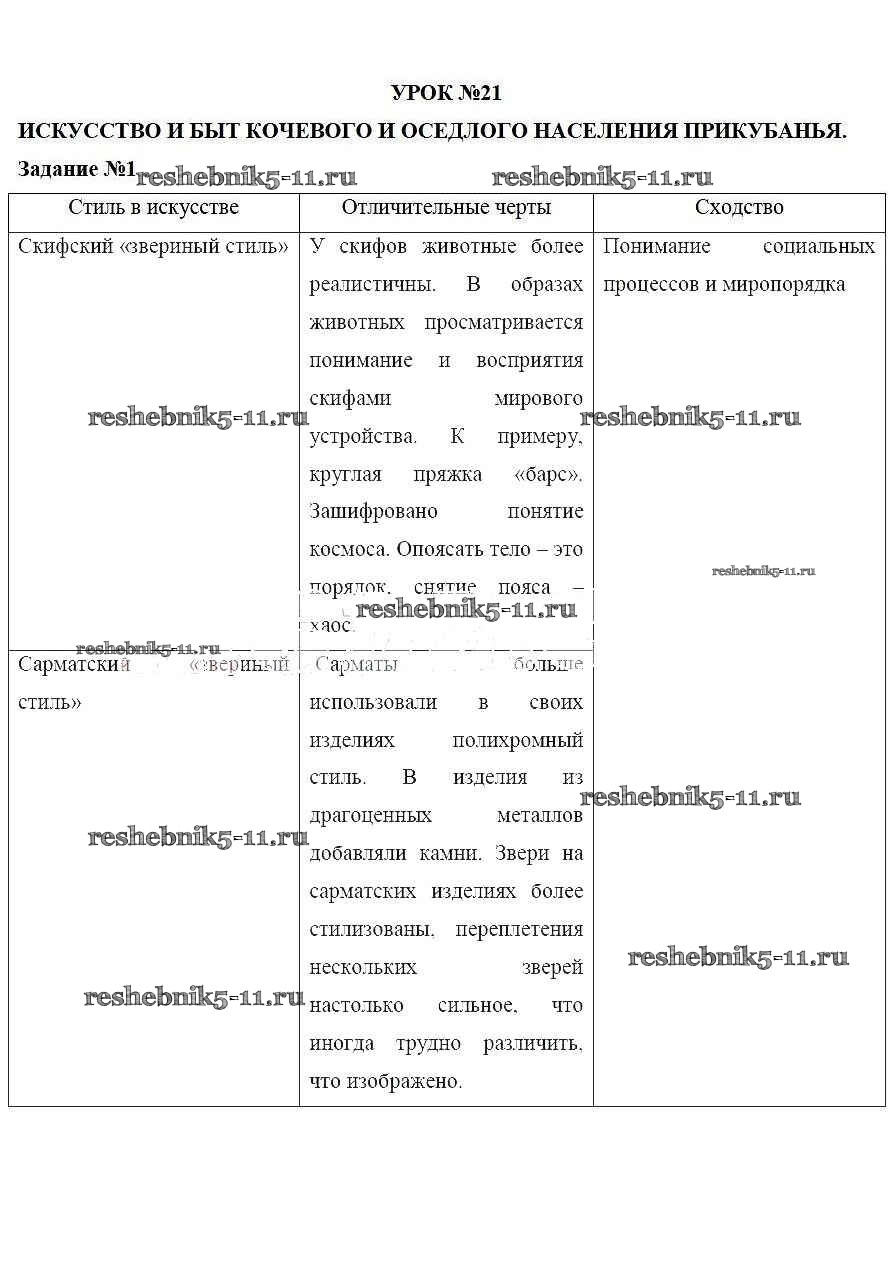 Готовая домашняя работа с ответами по Кубановедению за 5 класс Трехбратов Рабочая тетрадь Традиция 2019 - Урок № 21. Искусство и быт кочевого и оседлого населения Прикубанья 1