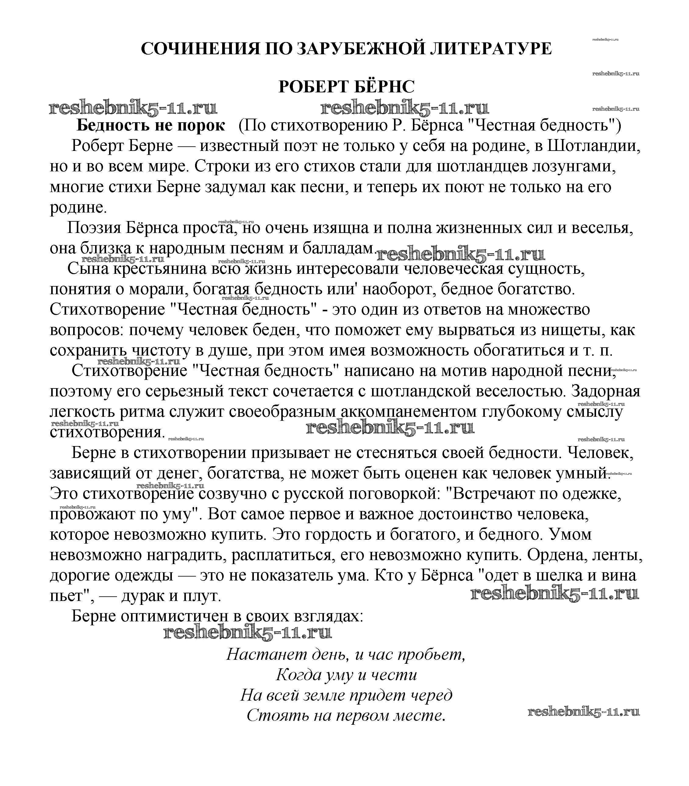 Готовая домашняя работа с ответами по Литературе за 5, 6, 7, 8, 9, 10 класс Белик, Музычук Сочинения Баро-Пресс 2017 - Сочинения по зарубежной литературе Бедность не порок (По стихотворению Р. Бёрнса "Честная бедность")