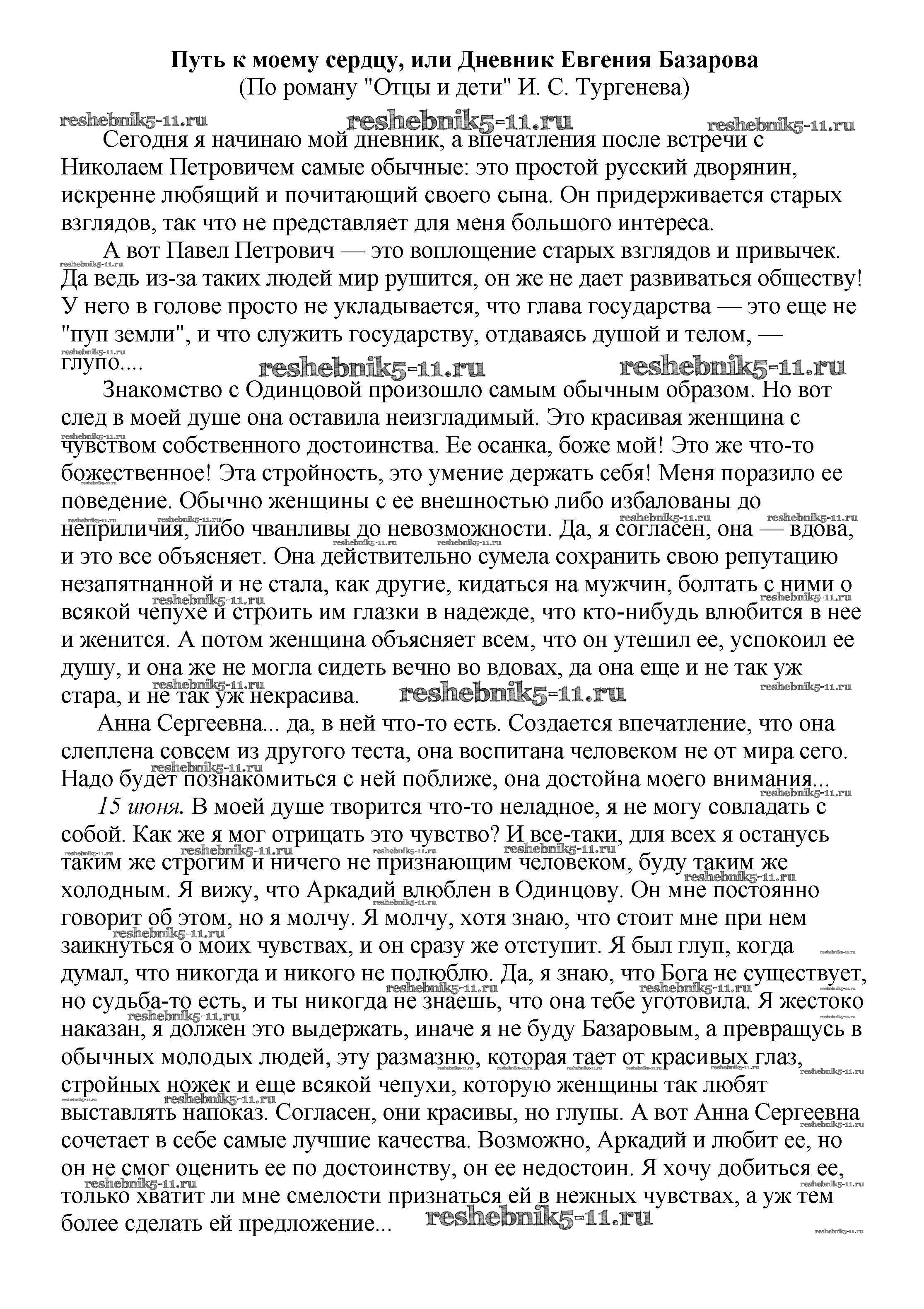 Готовая домашняя работа с ответами по Литературе за 5, 6, 7, 8, 9, 10 класс Белик, Музычук Сочинения Баро-Пресс 2017 - Сочинения по русской литературе Путь к моему сердцу, или Дневник Евгения Базарова (По роману "Отцы и дети" И. С. Тургенева)