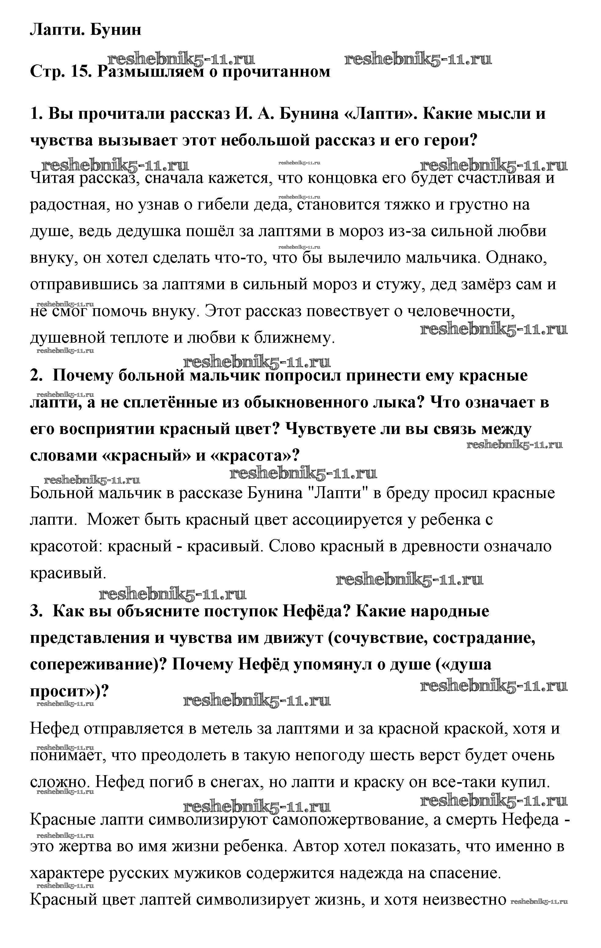 Готовая домашняя работа с ответами по Литературе за 5 класс Коровина, Коровин, Журавлев Учебник Часть 1, 2 Просвещение 2016 ФГОС - Бунин (Страницы) 15