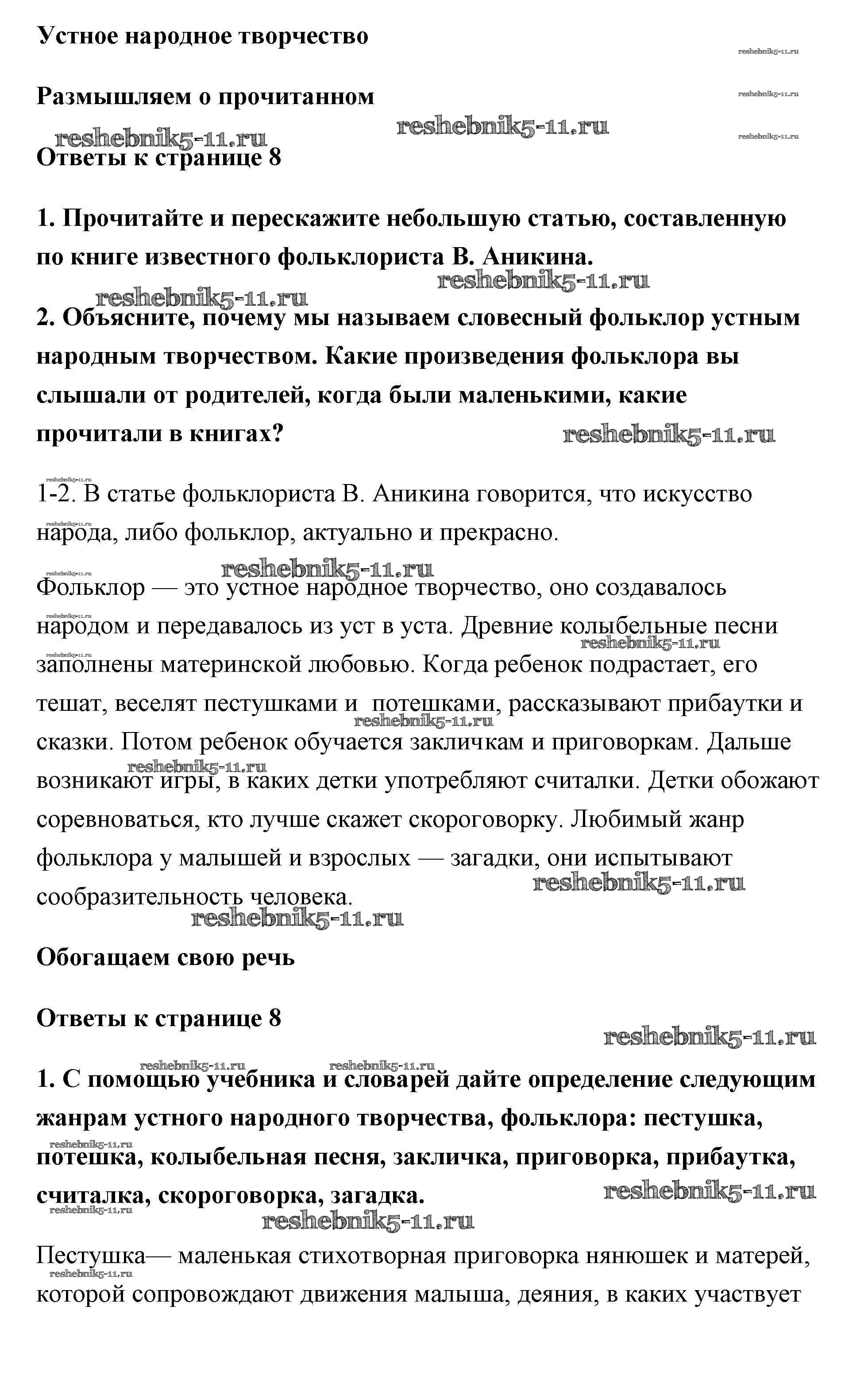 Готовая домашняя работа с ответами по Литературе за 5 класс Коровина, Коровин, Журавлев Учебник Часть 1, 2 Просвещение 2016 ФГОС - Часть 1 (Страницы) 8
