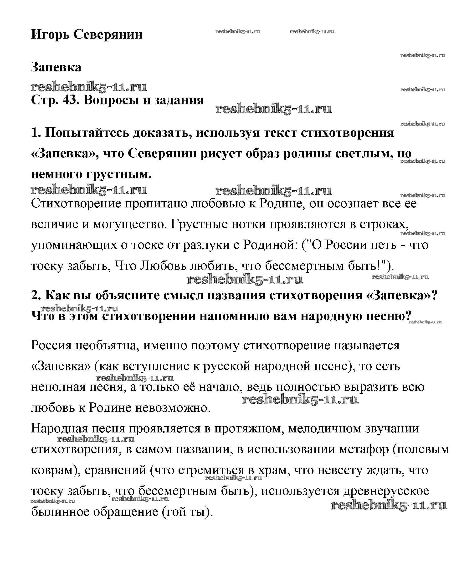 Готовая домашняя работа с ответами по Литературе за 5 класс Чертов, Трубина, Ипполитова, Мамонова Учебник Часть 1, 2 Просвещение 2018 ФГОС - И. Северянин страница 43