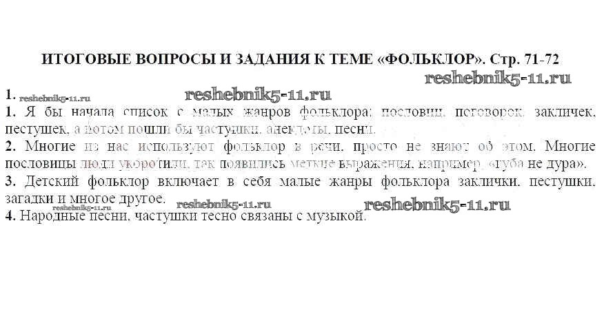 Готовая домашняя работа с ответами по Литературе за 5 класс Курдюмова Учебник-хрестоматия Вертикаль Часть 1, 2 Дрофа 2016 ФГОС - Итоговые вопросы и задания на стр. 71-72 1