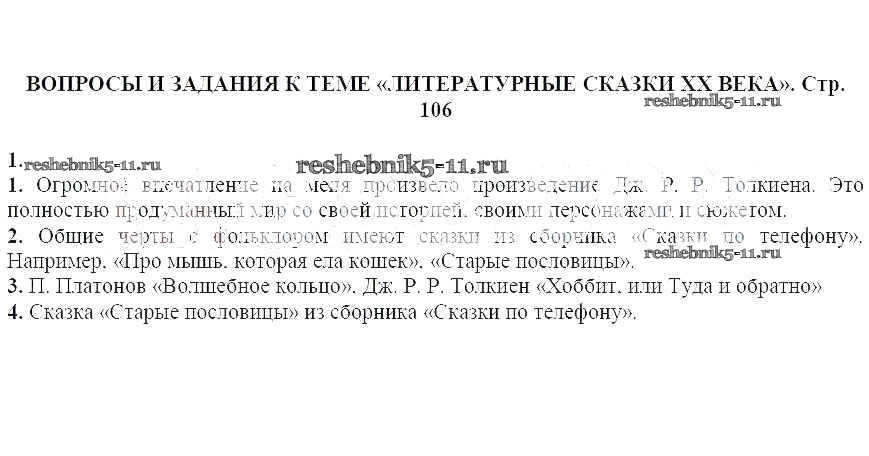 Готовая домашняя работа с ответами по Литературе за 5 класс Курдюмова Учебник-хрестоматия Вертикаль Часть 1, 2 Дрофа 2016 ФГОС - Вопросы и задания на стр. 106 1