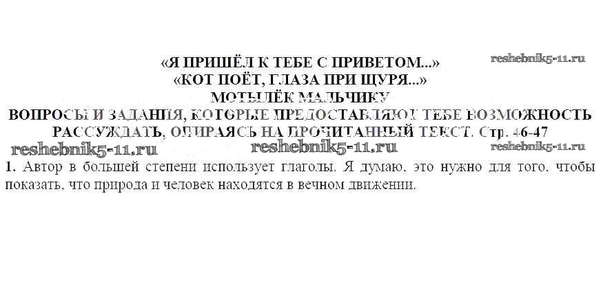 Решебник / часть 2 / Я пришёл к тебе с приветом... Кот поёт, глаза при щуря. Мотылёк мальчику / Вопросы и задания, которые дают тебе возможность рассуждать, опираясь на прочитанный текст (стр. 46-47) / 1