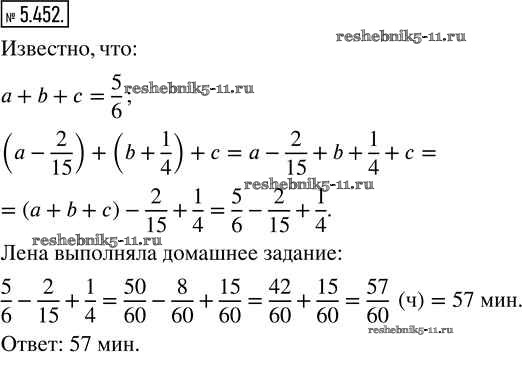 Готовая домашняя работа с ответами по Математике за 5 класс Виленкин, Жохов, Чесноков, Александрова, Шварцбурд Учебник Часть 2 Просвещение 2021 - Глава 5. Обыкновенные дроби 5.452