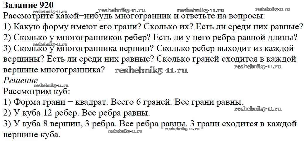 Готовая домашняя работа с ответами по Математике за 5 класс Дорофеев, Шарыгин, Суворова, Бунимович, Кузнецова, Минаева, Рослова Учебник Просвещение 2015 ФГОС - 10.1. Геометрические тела и их изображение 920