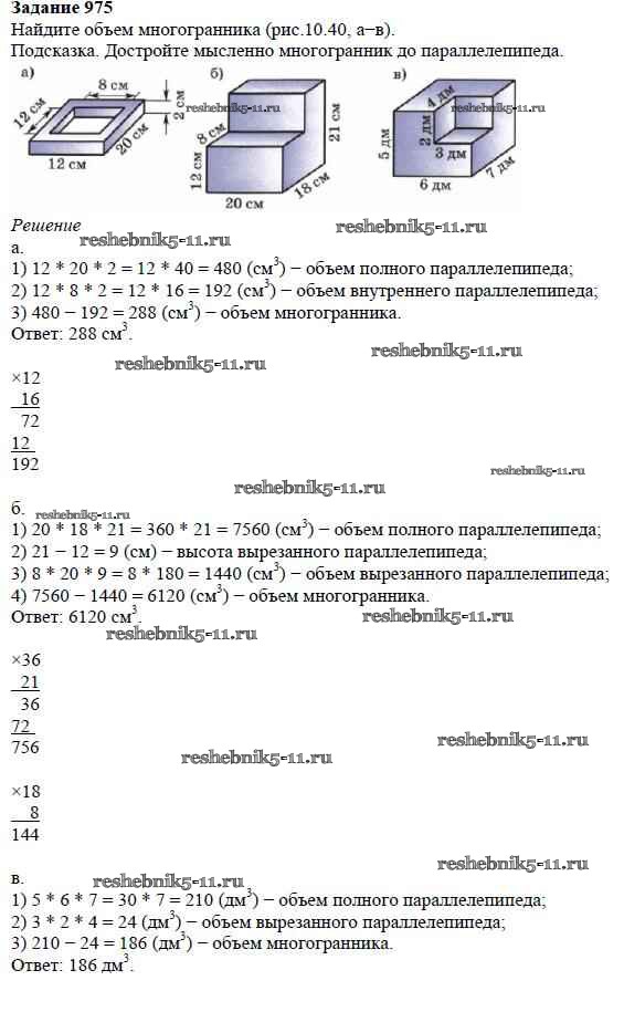 Готовая домашняя работа с ответами по Математике за 5 класс Дорофеев, Шарыгин, Суворова, Бунимович, Кузнецова, Минаева, Рослова Учебник Просвещение 2015 ФГОС - 10.3. Объем параллелепипеда 975