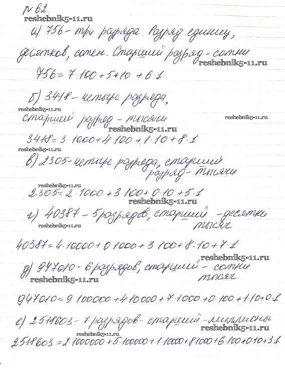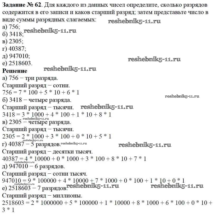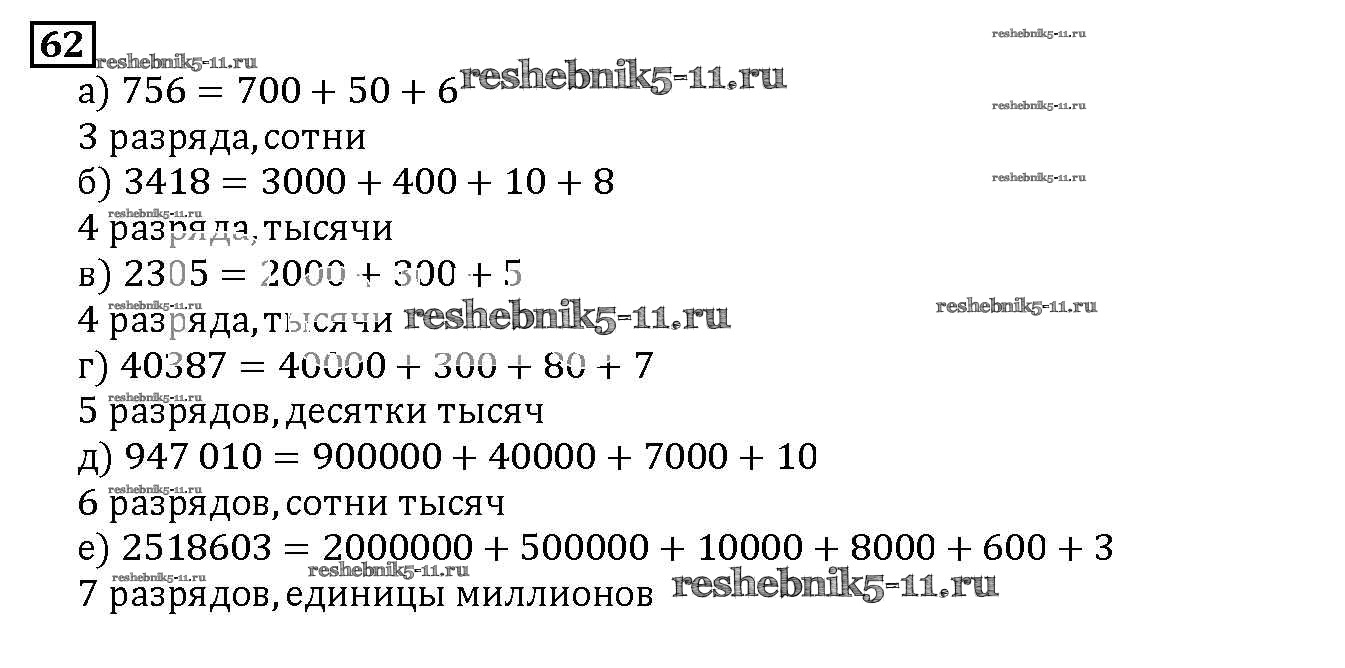 Готовая домашняя работа с ответами по Математике за 5 класс Дорофеев, Шарыгин, Суворова, Бунимович, Кузнецова, Минаева, Рослова Учебник Просвещение 2015 ФГОС - 2.1. Как записывают и читают натуральные числа 62