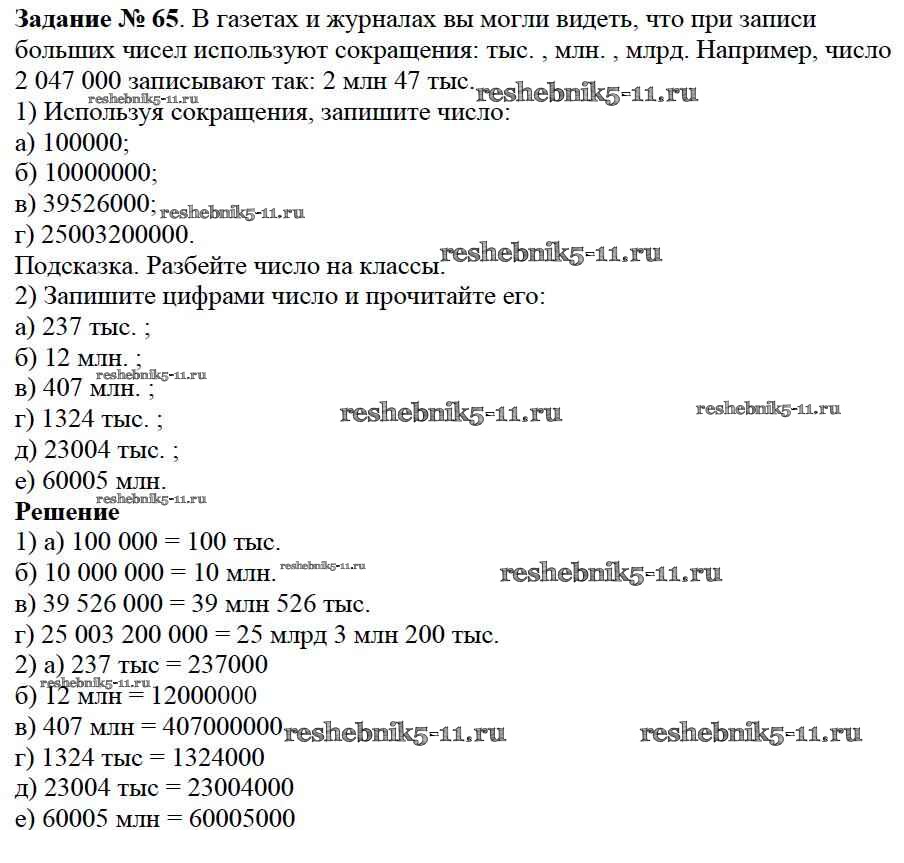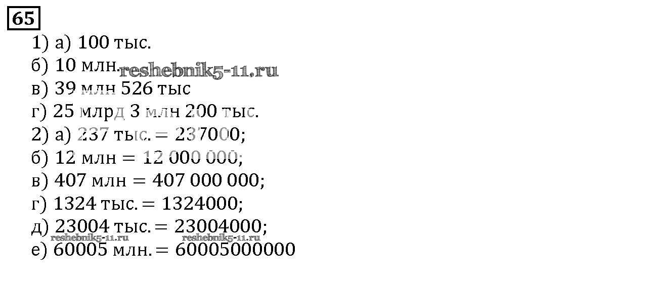 Готовая домашняя работа с ответами по Математике за 5 класс Дорофеев, Шарыгин, Суворова, Бунимович, Кузнецова, Минаева, Рослова Учебник Просвещение 2015 ФГОС - 2.1. Как записывают и читают натуральные числа 65