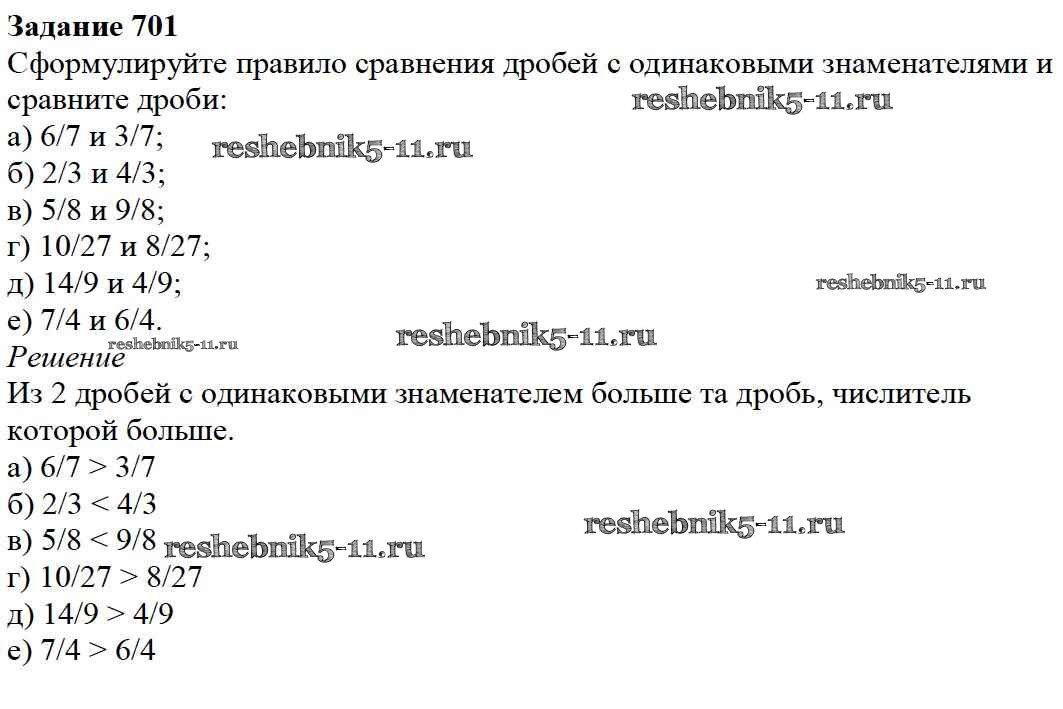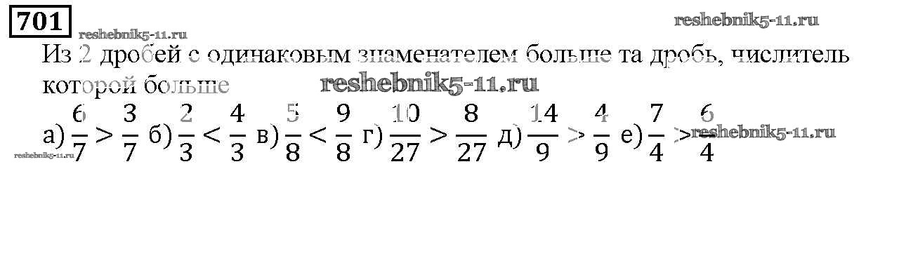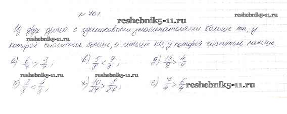 Готовая домашняя работа с ответами по Математике за 5 класс Дорофеев, Шарыгин, Суворова, Бунимович, Кузнецова, Минаева, Рослова Учебник Просвещение 2015 ФГОС - 8.5. Сравнение дробей 701