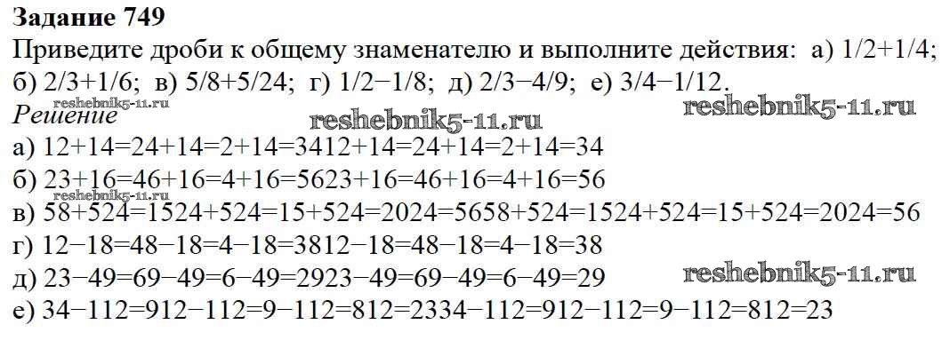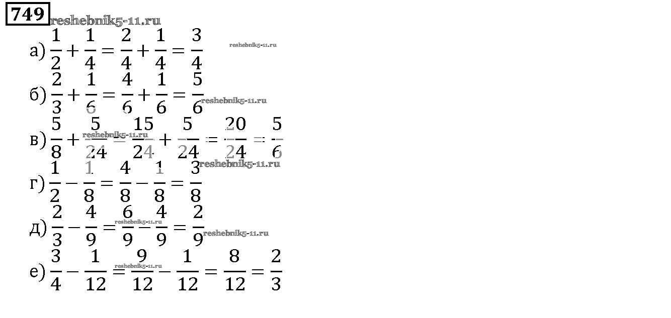 Готовая домашняя работа с ответами по Математике за 5 класс Дорофеев, Шарыгин, Суворова, Бунимович, Кузнецова, Минаева, Рослова Учебник Просвещение 2015 ФГОС - 9.1. Сложение и вычитание дробей 749