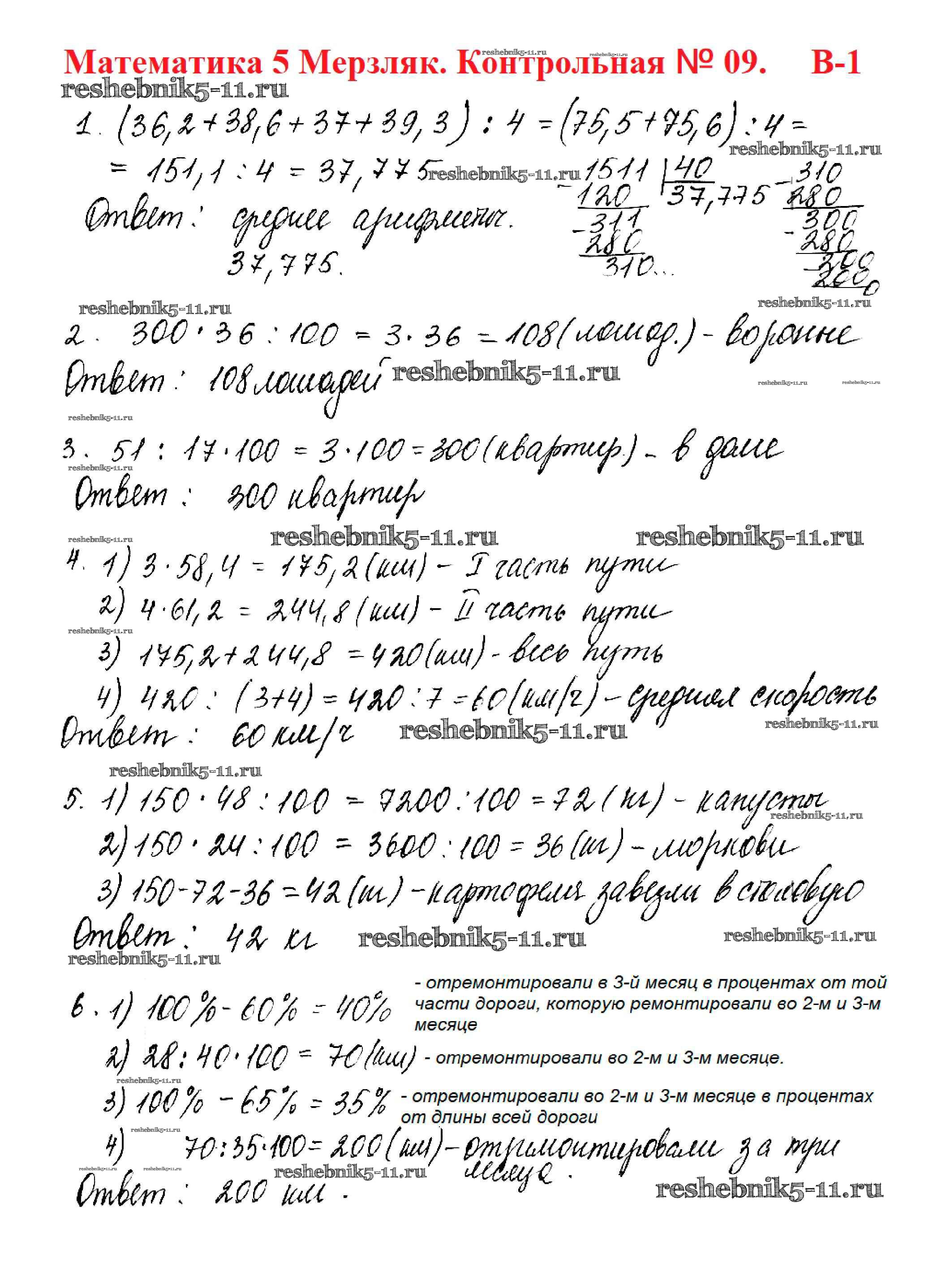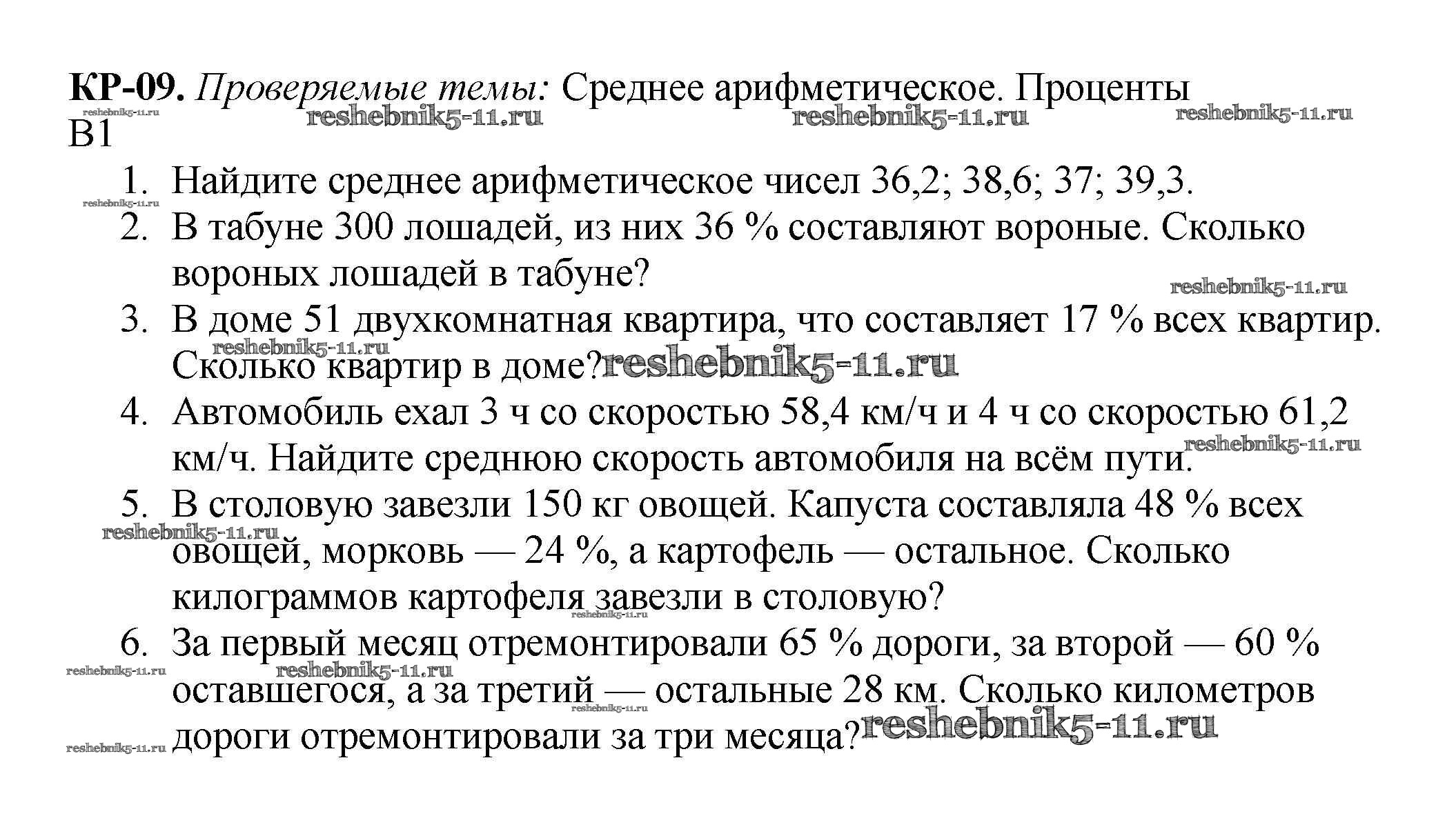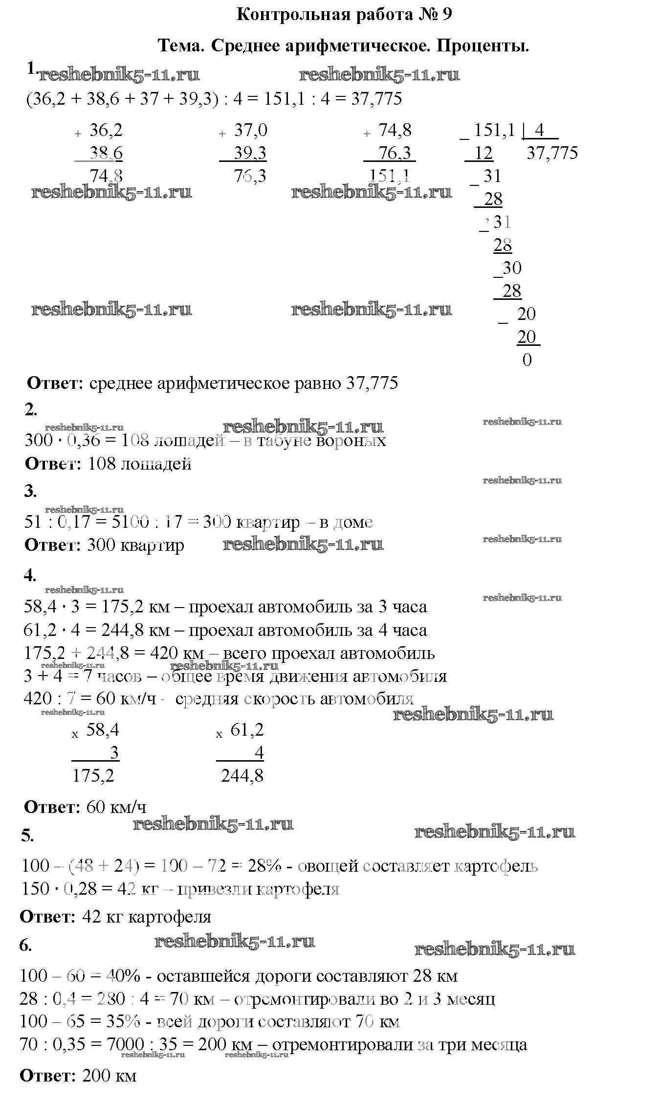 Готовая домашняя работа с ответами по Математике за 5 класс Мерзляк, Полонский, Якир, Рябинович Дидактические материалы Алгоритм успеха Вентана-граф 2017 ФГОС - КР №9. Среднее арифметическое. Проценты вариант 1