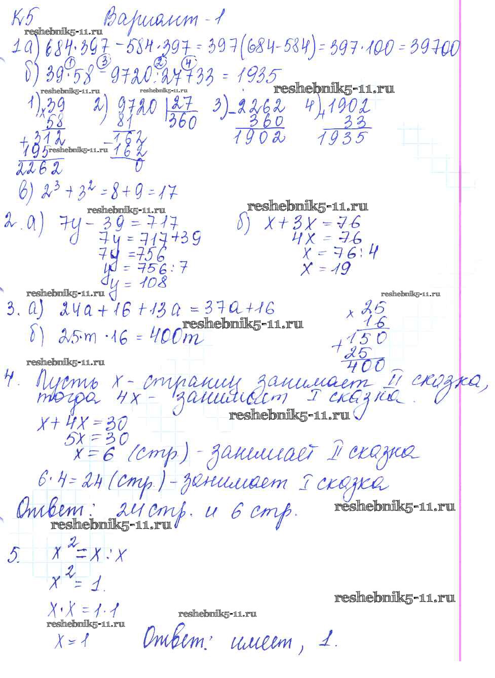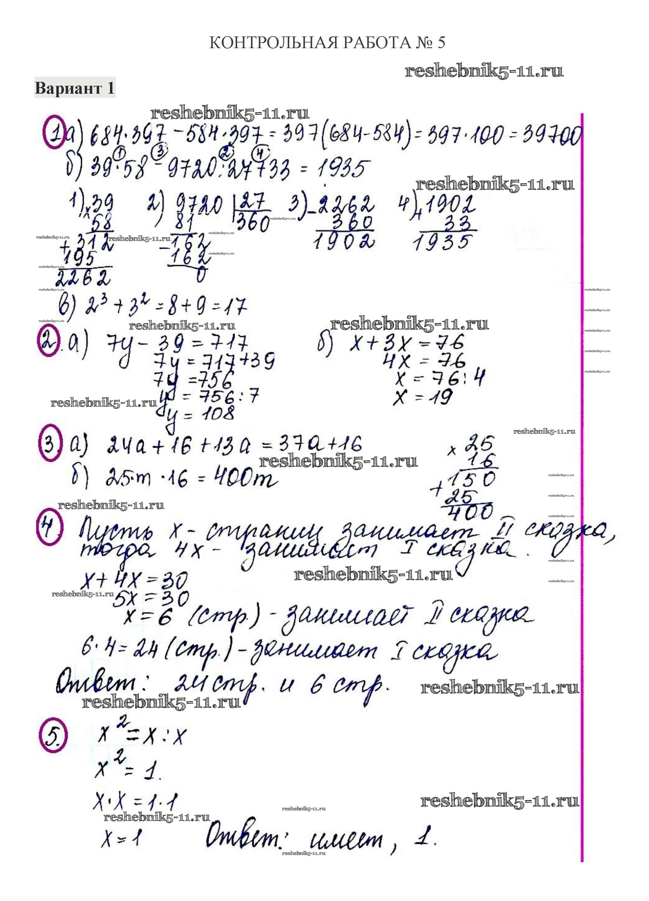 Готовая домашняя работа с ответами по Математике за 5 класс Жохов, Крайнева Контрольные работы Мнемозина 2012 ФГОС - КР-5. Варианты 1